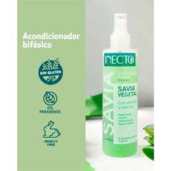 Su fórmula bifásica permite nutrir profundamente gracias a la Savia Vegetal, rica en aminoácidos y vitaminas esenciales combinadas en dos capas que se fusionan al agitarlas, liberando una fragancia fresca y delicada. Al vaporizar a unos 20 cm sobre el cabello húmedo, secado a toalla o seco, la mezcla actúa como desenredante sin enjuague: facilita el peinado y aporta brillo sin dejar residuos. Además, es libre de siliconas, parabenos y petrolatos, ni añade sal, y no fue testeado en animales, lo que lo convierte en una alternativa respetuosa con el cabello y el medio ambiente.