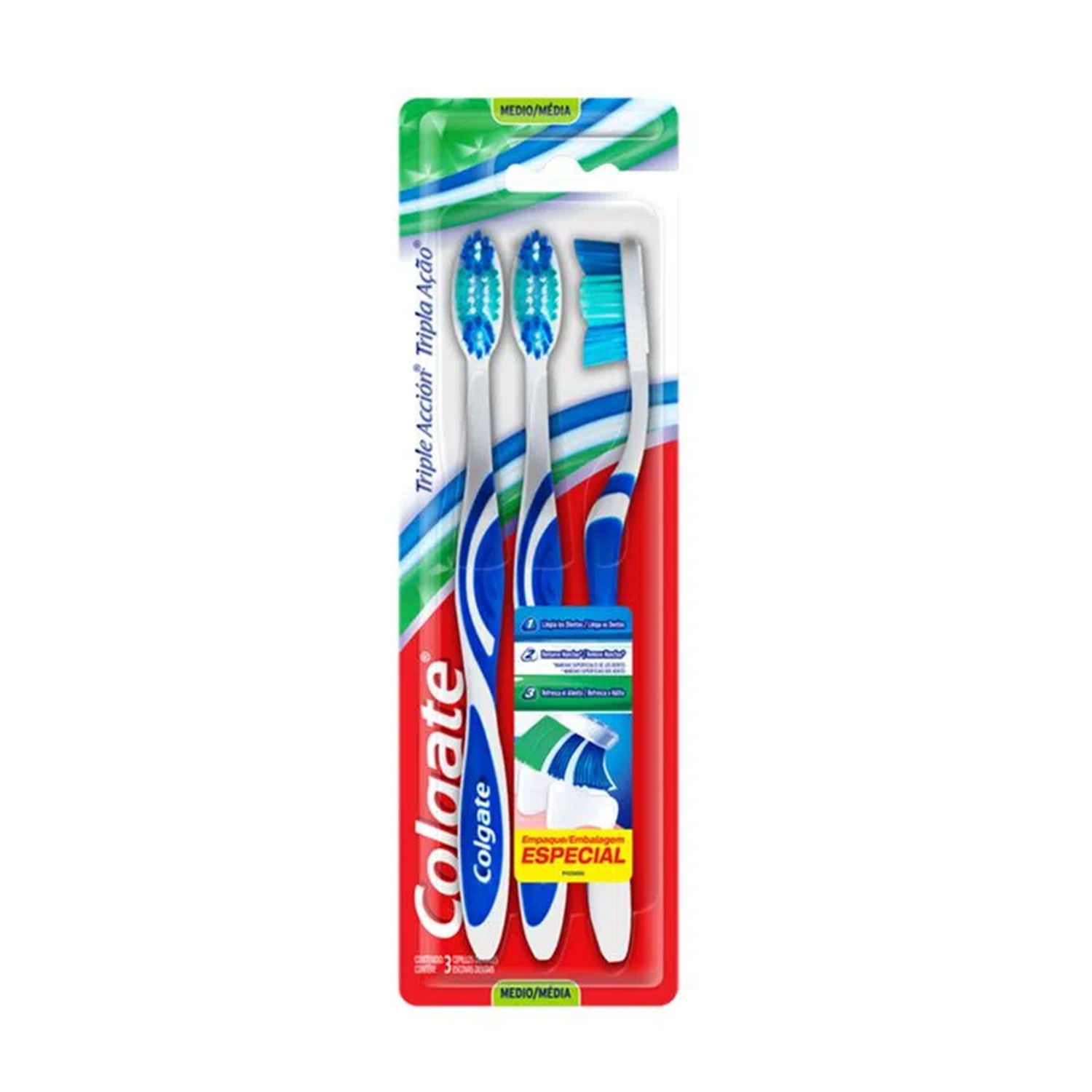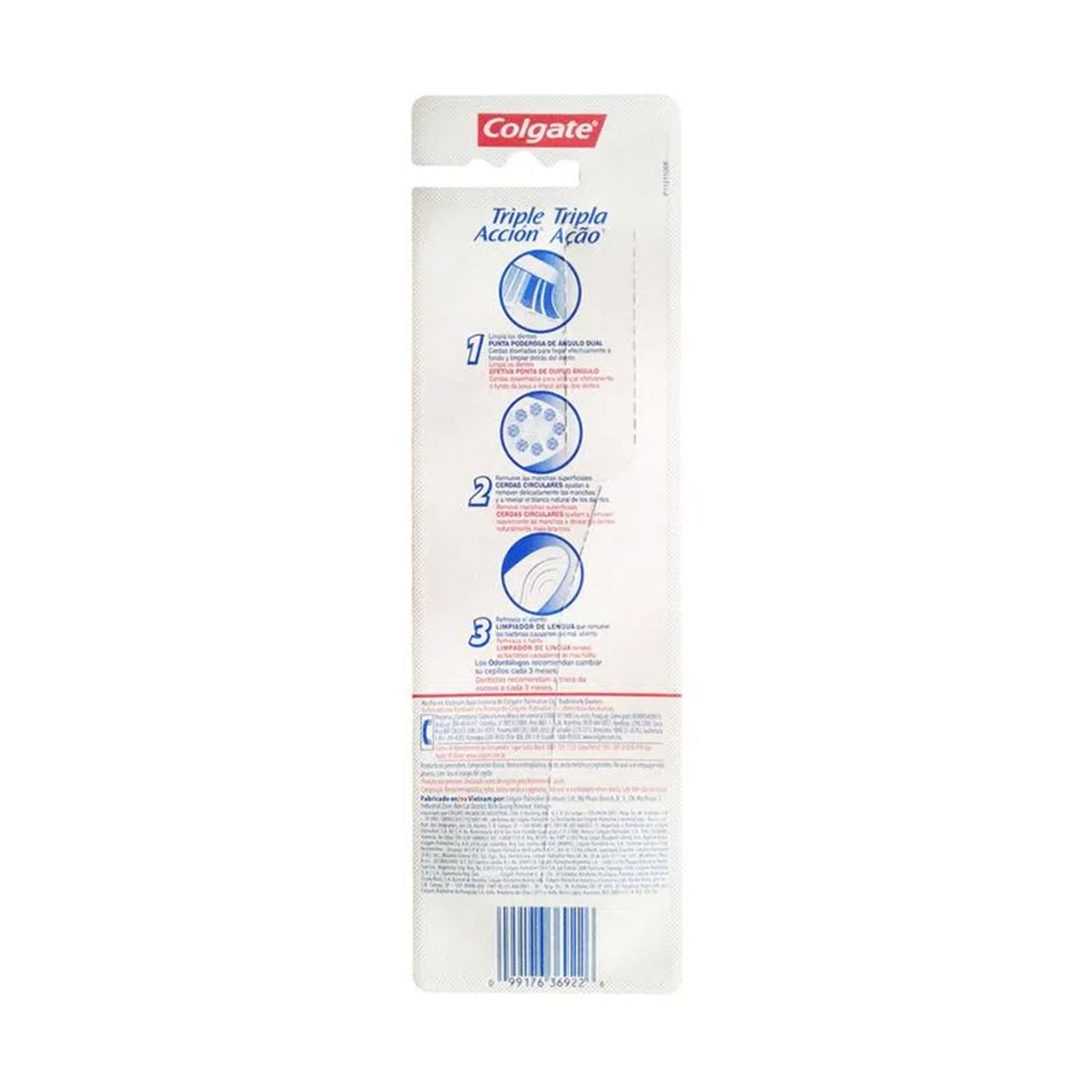 Cerdas en punta poderosa de doble ángulo que aseguran una limpieza profunda al llegar de manera efectiva a la parte posterior de la boca (dientes posteriores). Exclusivo limpiador de lengua que elimina las bacterias en esa área causantes del mal aliento, y cerdas de diseño circular que ayudan a remover suavemente las manchas superficiales de los dientes.