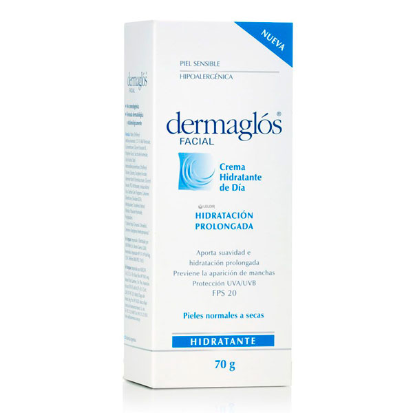La Crema Hidratante de Día SPF 20 de Dermaglós especialmente indicada para pieles normales a secas proporciona la hidratación necesaria para mantener la piel suave, luminosa y con sensación de bienestar. Sus componentes normalizan la hidratación y previenen el envejecimiento prematuro de la piel, protegiéndola de los rayos solares (UVA/UVB) ya que cuenta con factor de protección solar 20 (FPS 20). Apta para piel sensible. Hipoalergénica. No comedogénica. Testeada dermatológica y oftalmológicamente.