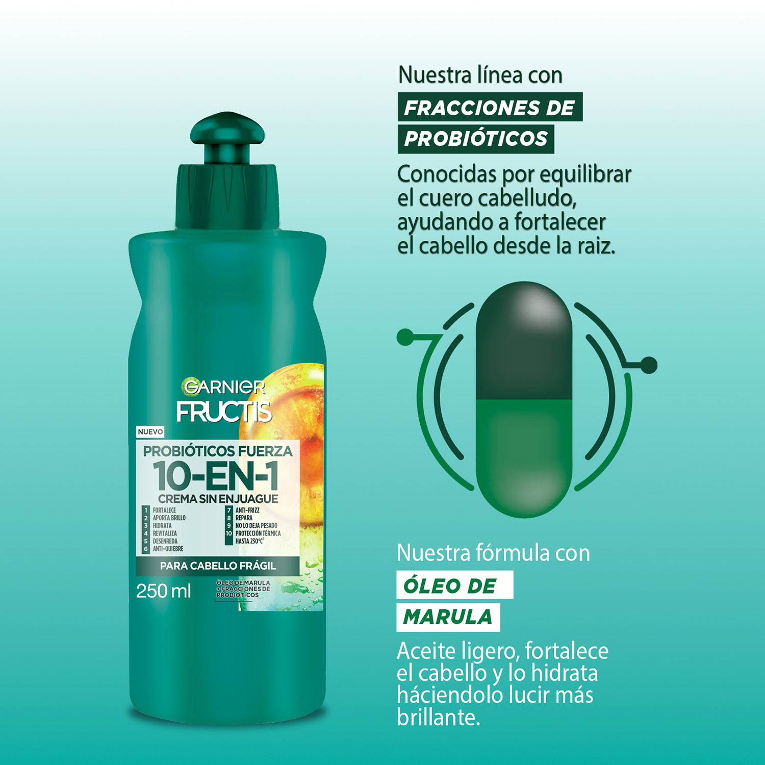 Contiene óleo de marula y fracciones de probióticos, dejando un pelo fuerte, brillante y sin frizz. Con fórmula vegana, sin parabenos ni colorantes artificiales, complementa tu rutina de Shampoo y Acondicionador Fructis Probióticos Fuerza. Todos los productos de Fructis son reciclables. Enjuagalos, separalos y dejalos en un contenedor/campana verde o punto verde.