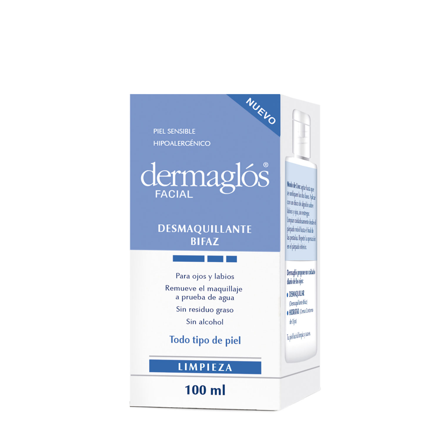 Agitar hasta que se unifiquen las dos fases, luego aplicar con un disco de algodón sobre los párpados sin restregar. Limpiar desde el párpado móvil hasta el final de las pestañas, repitiéndolo sobre el párpado inferior.