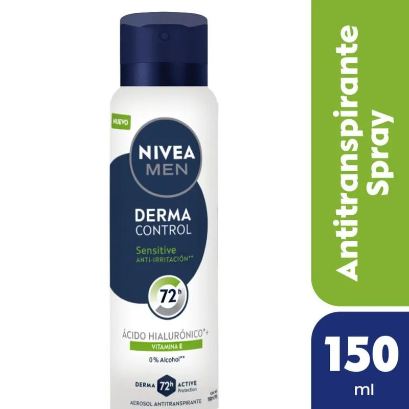 El Desodorante antitranspirante NIVEA MEN Derma Control Sensitive en aerosol, brinda 72 horas de confiable protección. Su fórmula avanzada contiene Ácido Hialurónico Puro y Vitamina E, ingredientes que cuidan tu piel. Está dermatológicamente probado y no contiene alcohol etílico, no causa irritación. Desarrollado especialmente para piel sensible.