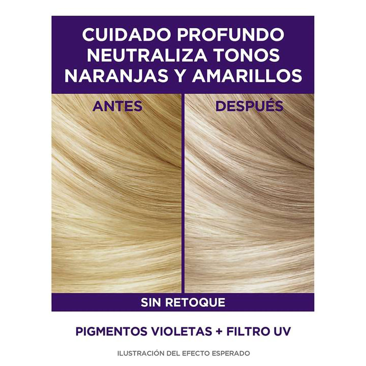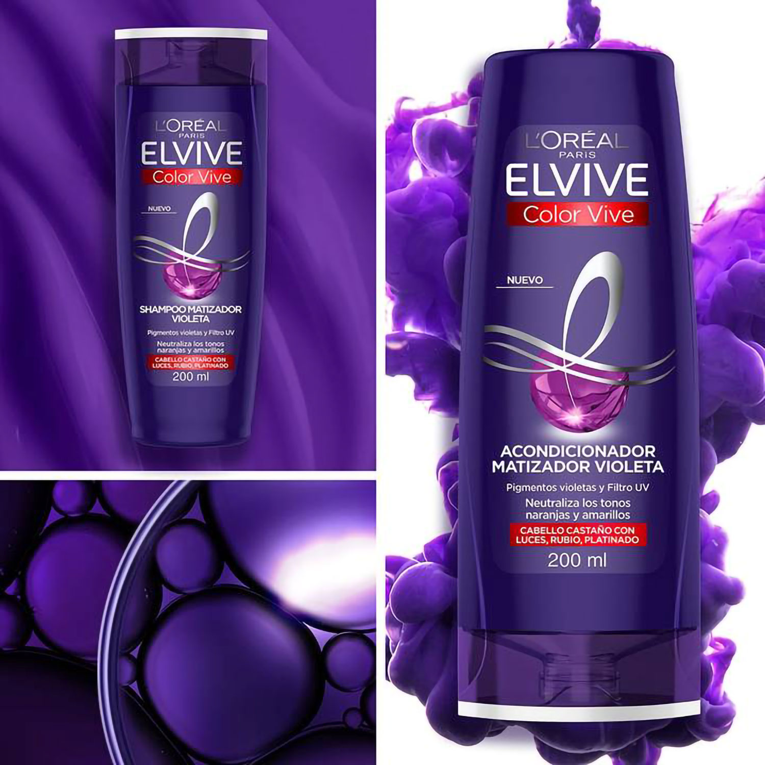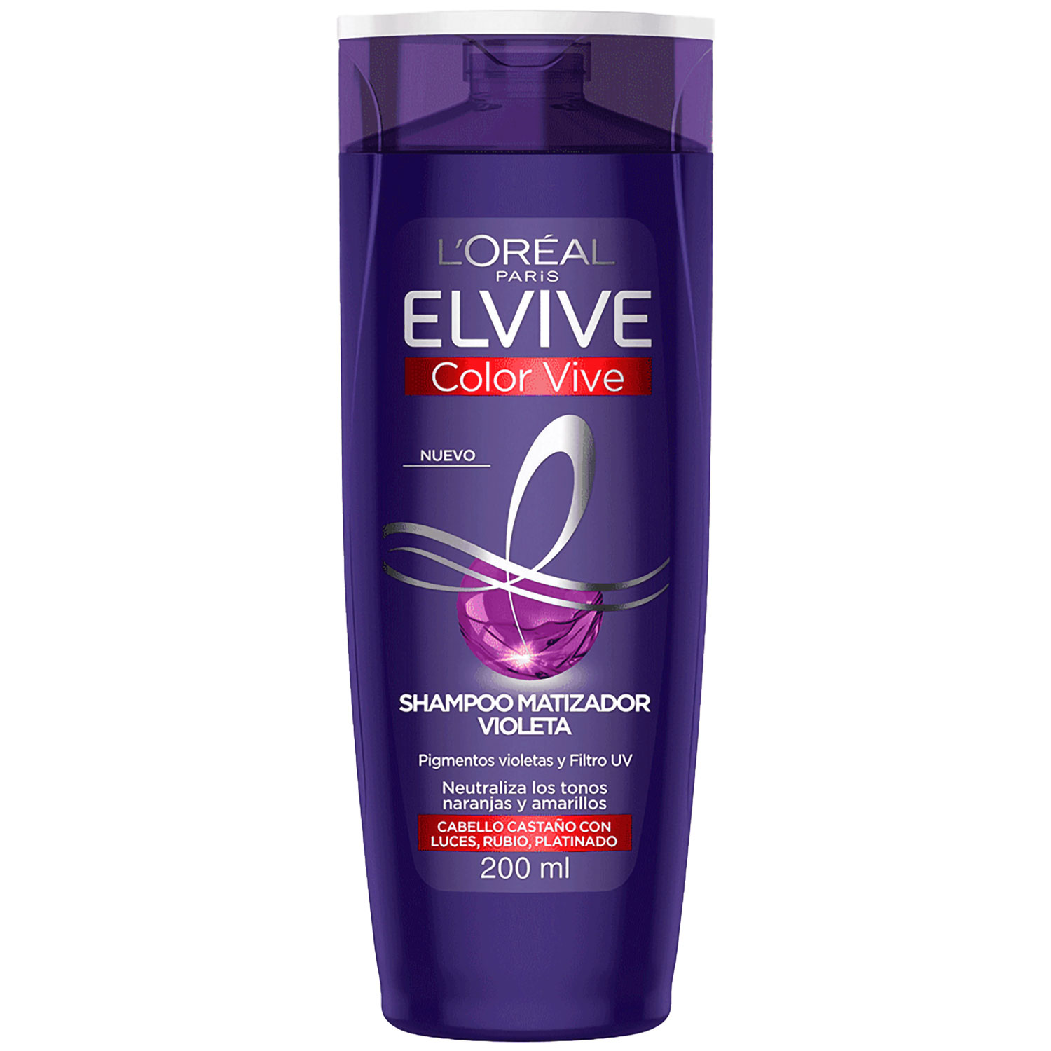 ¿Cómo funciona Color Vive Purple? El color violeta es opuesto al amarillo en el círculo cromático, y su tonalidad incluida en la fórmula del shampoo Purple ayuda a neutralizar los tonos amarillentos. El shampoo Purple también es conocido como Silver. Nuestra nueva fórmula especializada en corrección del color Purple nutre el cabello y neutraliza los tonos amarillos, naranjas y cobrizos no deseados en un solo uso, para ayudar a que el cabello se vea brillante y espléndido. El Shampoo Color Vive Purple fusiona la ciencia del color con la experiencia cuidadosa de Elvive dejando tu pelo nutrido sin perder su tono. El resultado es un platinado más puro, rubios más brillantes y perfectamente definidos.