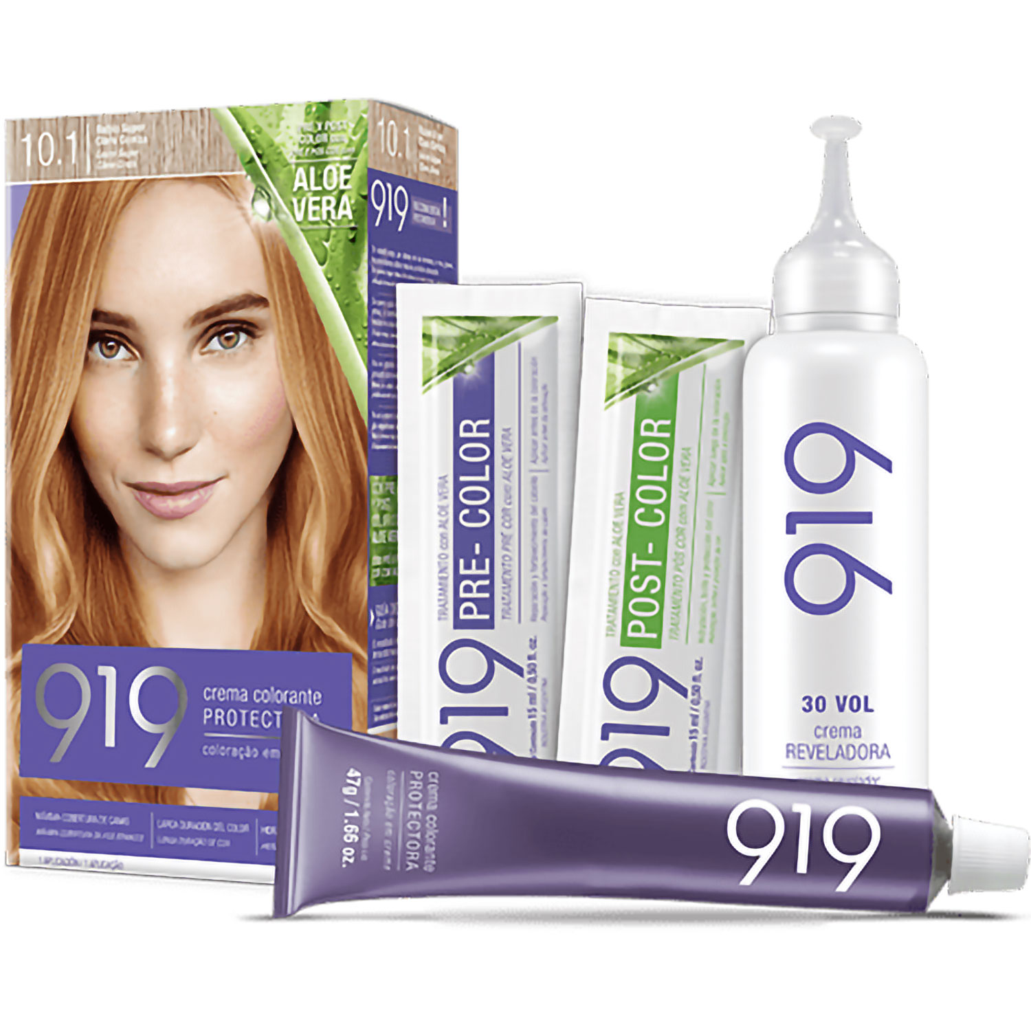 Kit de coloración 919 con PRE y POST color con Aloe Vera. Máxima cobertura de canas. Larga duración del color. Hidratación y brillo.