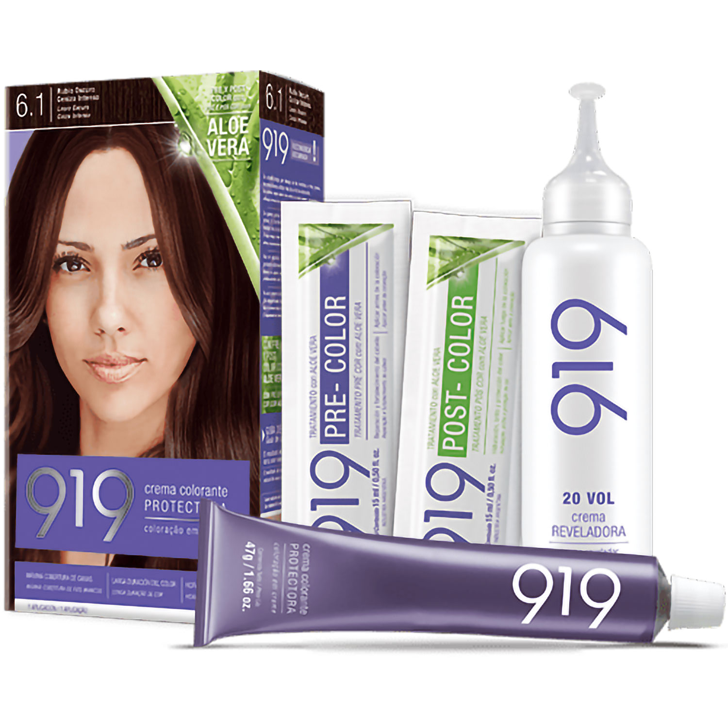 Kit de coloración 919 con PRE y POST color con Aloe Vera. Máxima cobertura de canas. Larga duración del color. Hidratación y brillo.